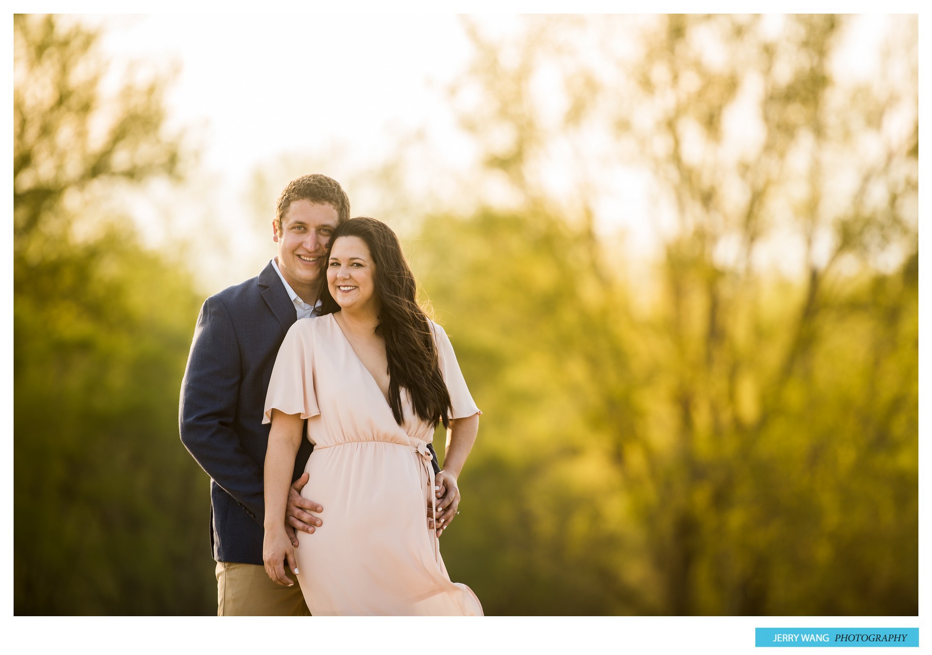 Photos from Jarett and Samantha's sunrise engagement session at the Grinter's Farm sunflower field in Lawrence, Kansas by Kansas City wedding photographer Jerry Wang Photography.