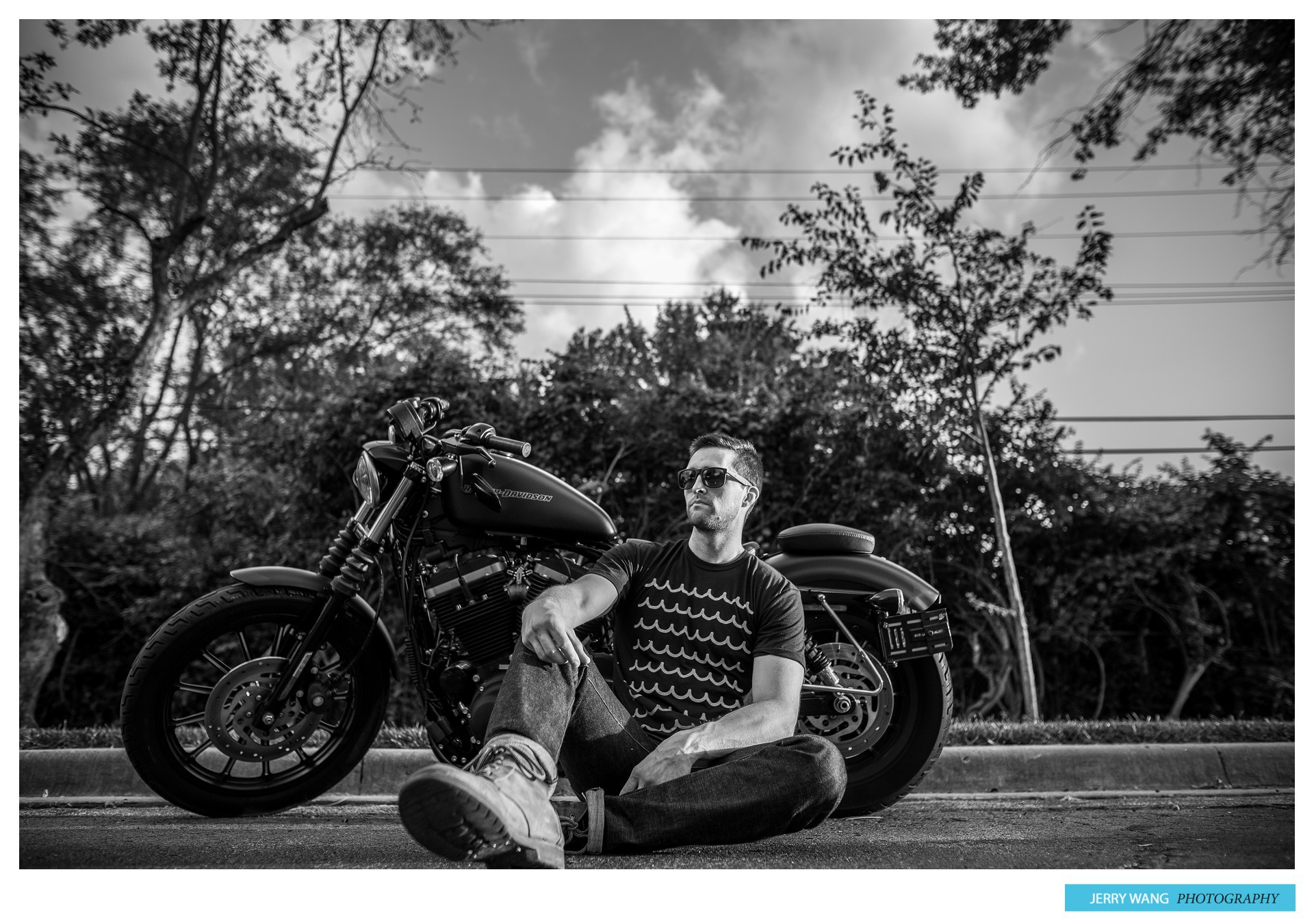 The new series of shirts have darker tones as their primary colors and I felt that this was the perfect opportunity to do a motorcycle styled shoot in high contrast black and white. The idea was inspired by the promo photos from Sons of Anarchy along with the Belstaff campaign featuring David Beckham. For this shoot, I recruited my friend and part time model extraordinaire Nick Nelson and his blacked out Harley Iron. For sake of time, we shot just before sunset on a side street next to his apartment complex. I liked the spot for its small cluster of trees and bushes that I knew would translate to a moodier background. I utilized the directional light for a harder, edgier look which was further enhanced in post processing.
